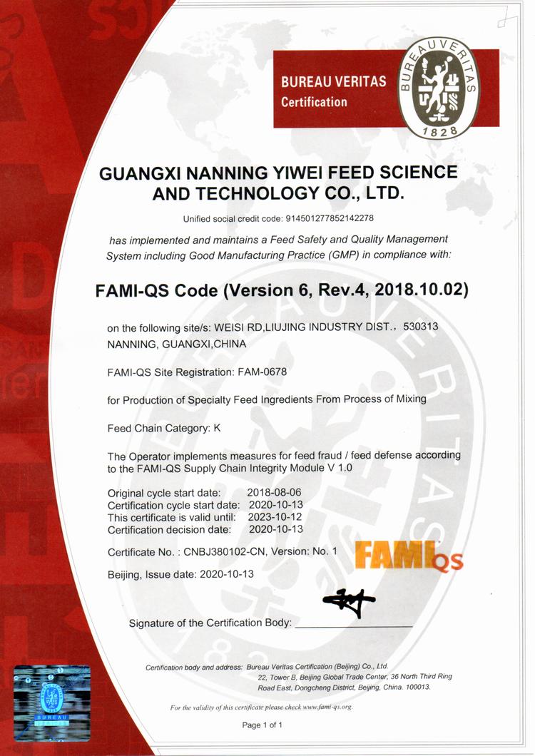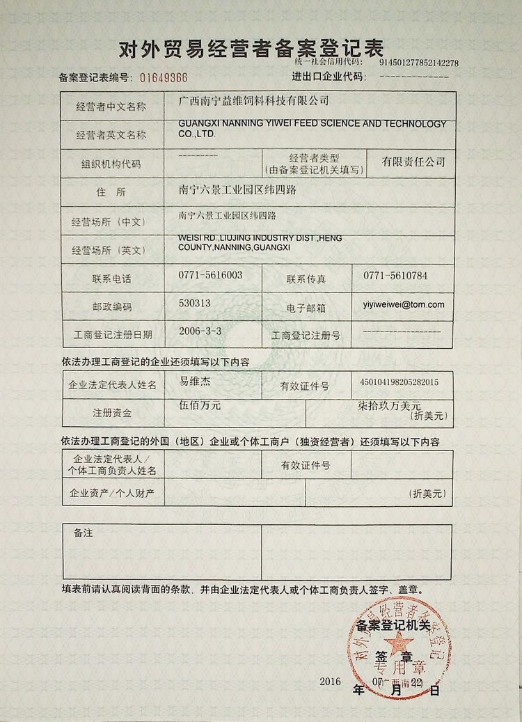 益維—出口飼料生產(chǎn)加工存放企業(yè)檢驗(yàn)檢疫注冊(cè)登記證